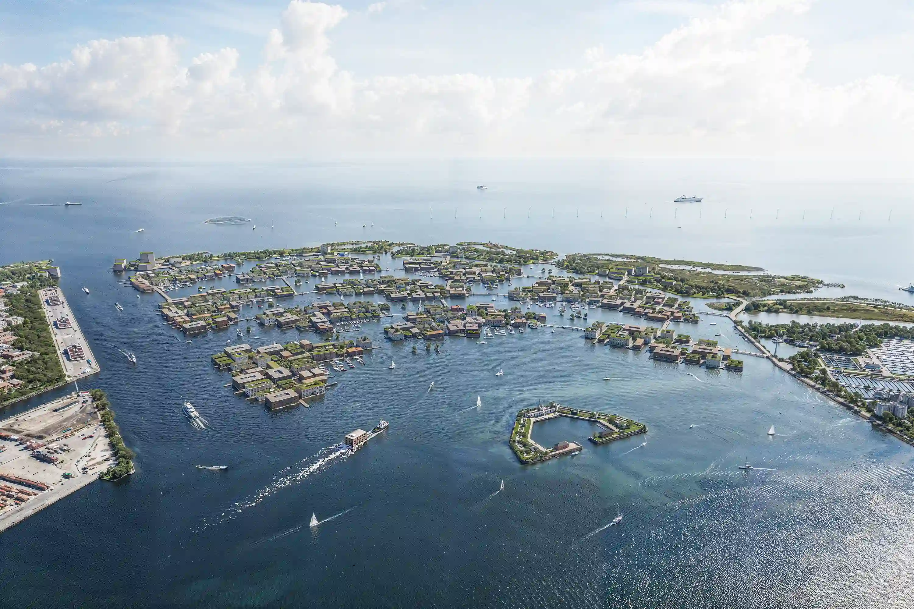 Floating buildings have been proven in several places in the world to be a far more efficient, flexible and sustainable development process. And in huge land reclamation projects like Lynetteholmen, the differences are crucial. Development with off-site prefabricated floating buildings could be started as soon as the outermost rock reef is fully established in 2026. But instead of planning based on hypothetical future forecasts, urban planning could be dynamically and responsively adapted as the city's needs and priorities change, instead of tearing down and building new. The next 50 years of CO2 emissions, noise and sediment dispersion associated with excavations, tamping and earthworks could be largely eliminated. Added to this is the inherent ability to adapt to the climate that floating buildings naturally possess in relation to sea level rises. The floating buildings are anchored to rpiles where they can easily move up and down, which ensures that the water and the life-giving current in Kongedybet can circulate freely under them and the associated natural habitats for plants and animals are thus preserved. And last but not least, the increasing quality of life, sense of community and accompanying recreational activity opportunities that lie side by side with the water instead of entrenching themselves behind higher and higher dykes.