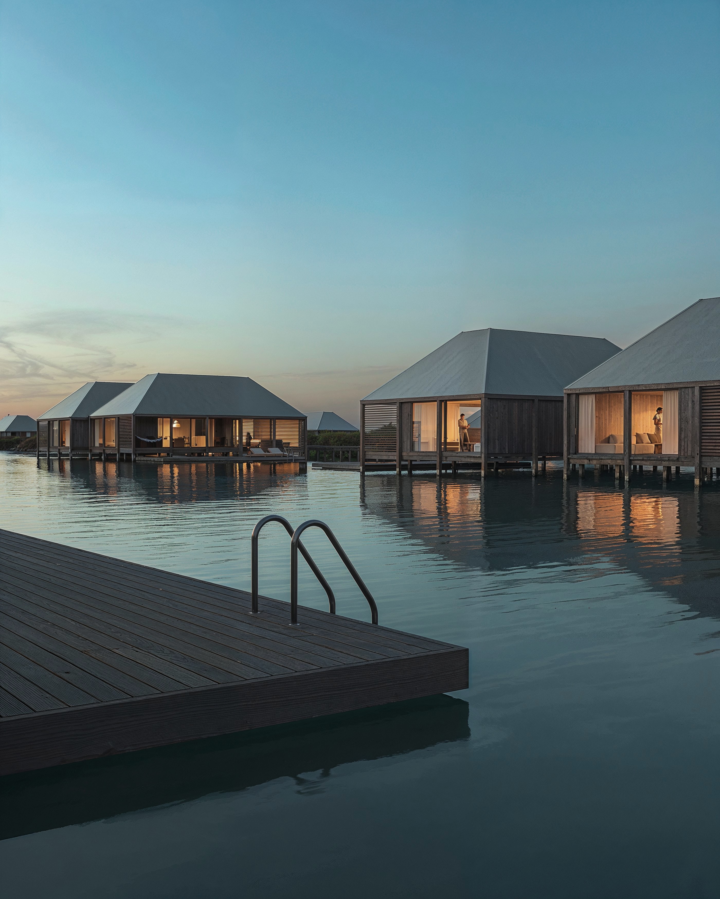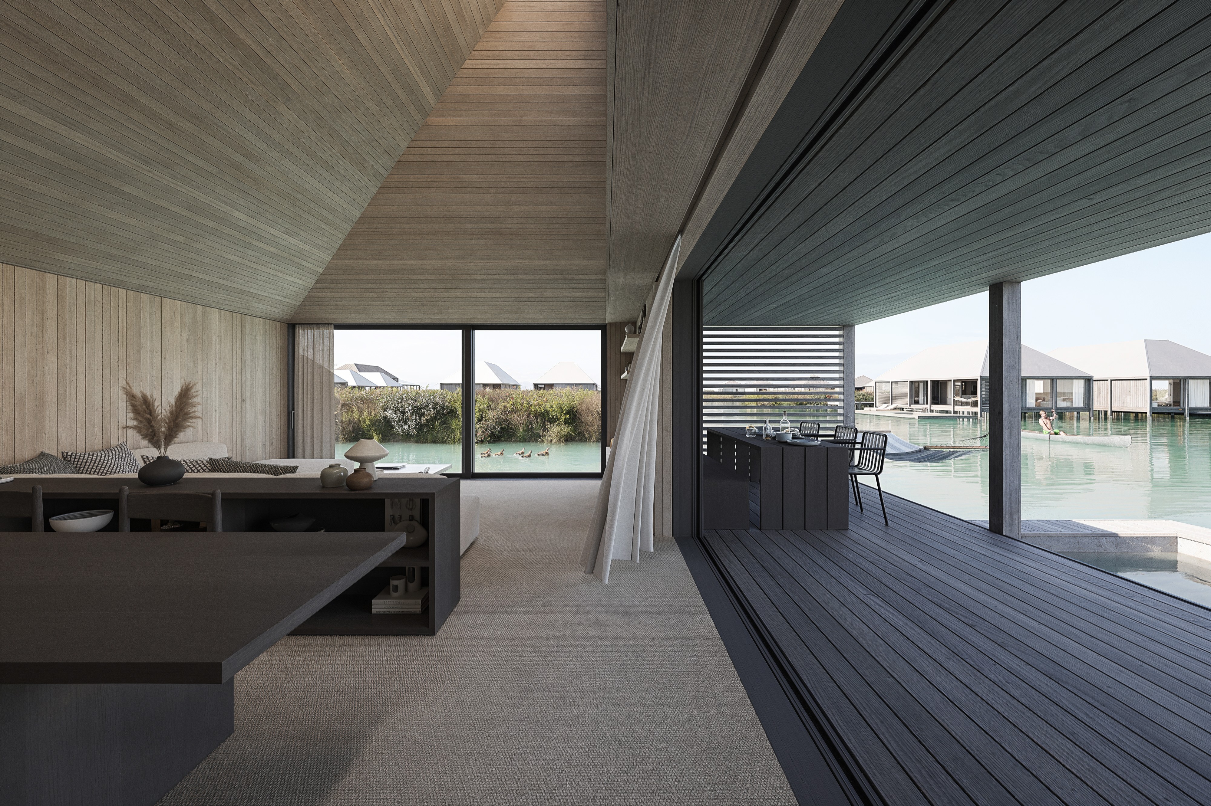 Central to the project are the timber stilt houses, small cabins inspired by the traditional fisherman’s huts and jetties which dot the lagoons and rivers of Southern Portugal. The cabins are accessible by foot via winding elevated walkways or by boat or kayak. The cabins will be prefabricated off site from Portuguese CLT reducing the impact of the construction on the delicate landscape.