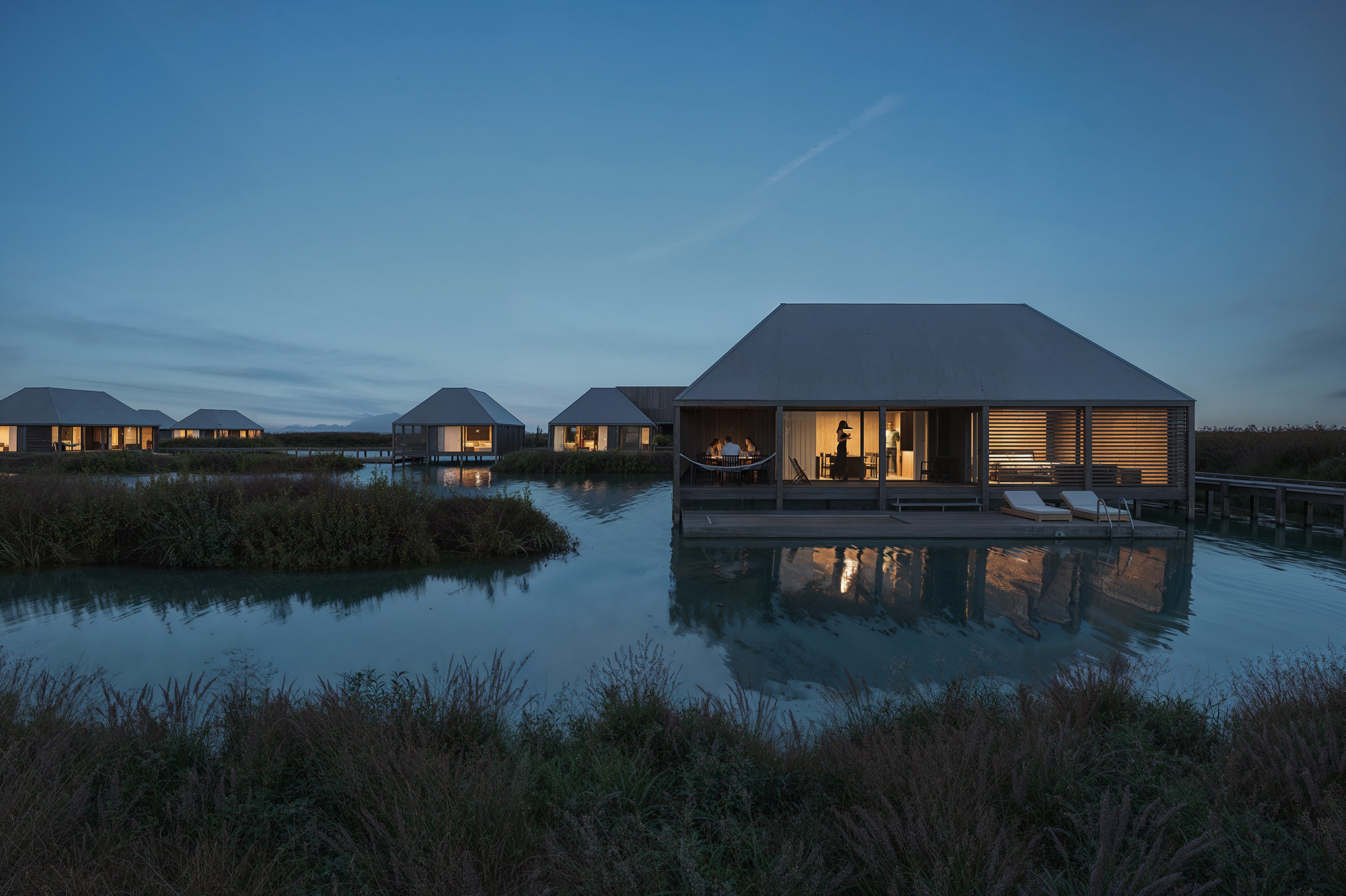 A public wooden walkway encircles the site and connects the different buildings along with a large section of the site which will be preserved as a wildlife refuge. The walkway will connect to a network of public trails and will include a spiraling birdwatching tower providing views across the wetlands and coast beyond.